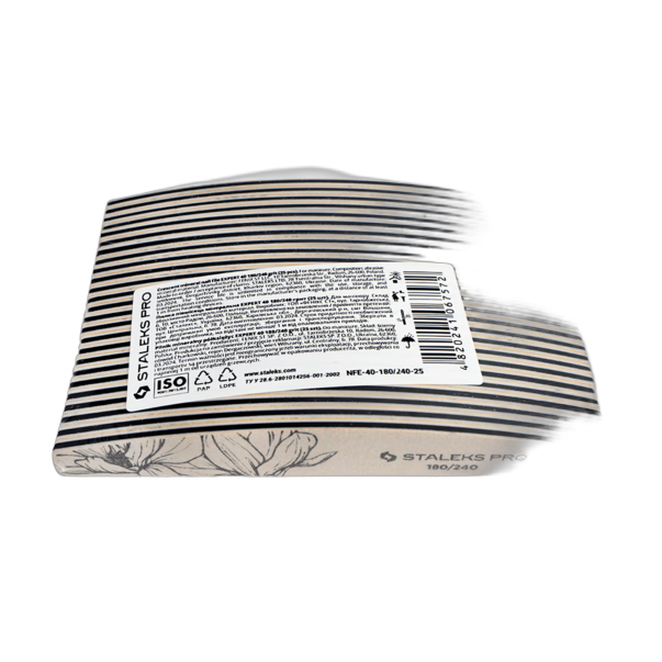 Tässä kaksipuolisessa mineraaliviilassa on kaksi erillistä karkeuspintaa saumattoman moniajoon. 180 karkeus puoli on täydellinen sekä luonnollisten että tekokynsien viilaamiseen ja tasoittamiseen valmisteltaessa lakkaus- tai geelikäsittelyä, kun taas 240 karkeuspuoli on räätälöity tekokynsien pidennysten muotoiluun ja hiomiseen. Mineraalihioma on poikkeuksellisen kestävää ja säilyttää suorituskykynsä koko käytön ajan. Erityinen stearaattipinnoite estää tukkeutumisen orgaanisesta pölystä, ja ohut sisäinen vaahtomuovikerros vaimentaa painetta kynsilevyä vasten traumojen estämiseksi. Pakkaus sisältää 25 viilaa – runsas tarjonta jokaiselle kynsialan ammattilaiselle tai kotona harrastavalle.