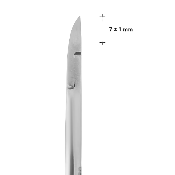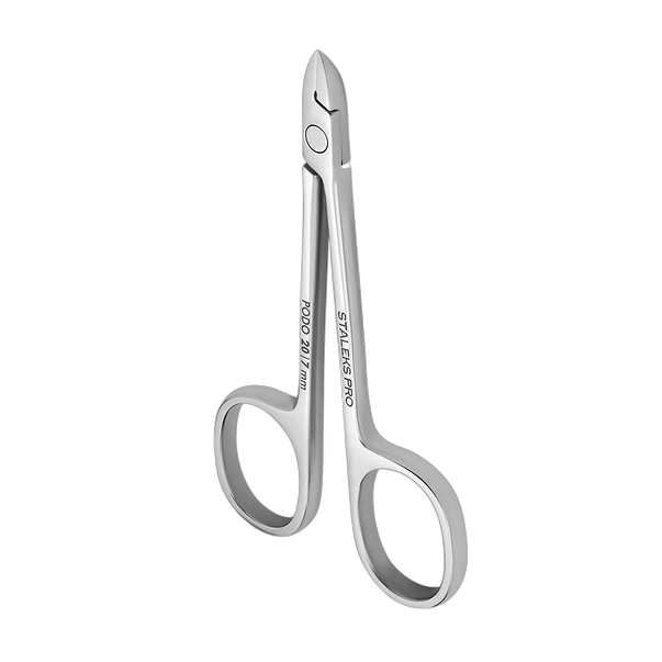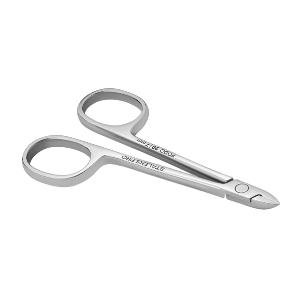 Кусачки PODO 20 оснащены ручками с классическими кольцами по типу маникюрных ножниц. Это решение улучшает маневренность инструмента в руке мастера, позволяя удерживать кусачки перпендикулярно стопе клиента. Рабочая часть «Глазок» выполнена в виде привычных кусачек для кожи. Отсутствие выступа в зоне режущего полотна позволяет максимально деликатно обрабатывать околоногтевую область: боковые валики, вросшие ногти и различные наросты.