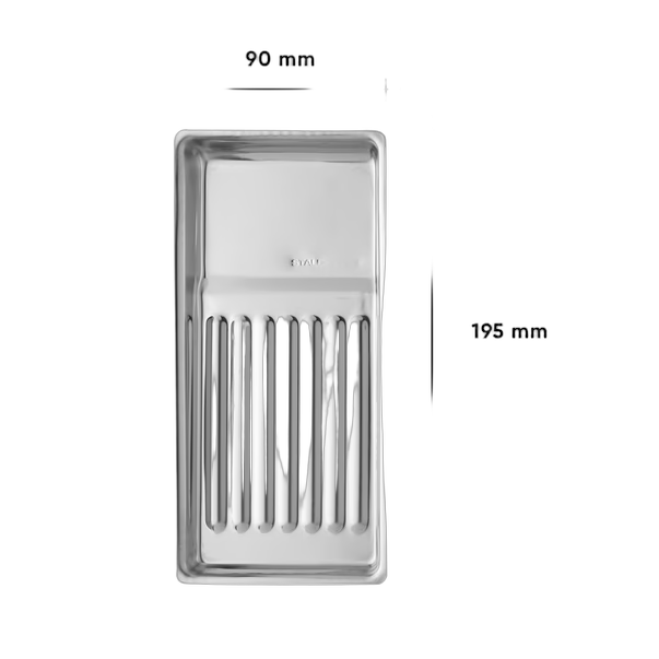 Mitat ja muotoilu: Kompakti 195 x 90 x 19 mm jalanjälki sopii kätevästi sterilointivälineisiin. Aaltomainen pohja, jossa on uria ja syvennyksiä, pitää instrumentit tukevasti oikeassa asennossa ja mahdollistaa täydellisen uppoamisen desinfiointiliuokseen perusteellista käsittelyä varten. Tärkeimmät edut: ruostumattoman teräksen kestävyys ja pitkäikäisyys; tehokasta sterilointia varten optimoitu rakenne; tilaa säästävä kompakti koko; ammattimaista laatua, joka on suunniteltu päivittäiseen intensiiviseen käyttöön.