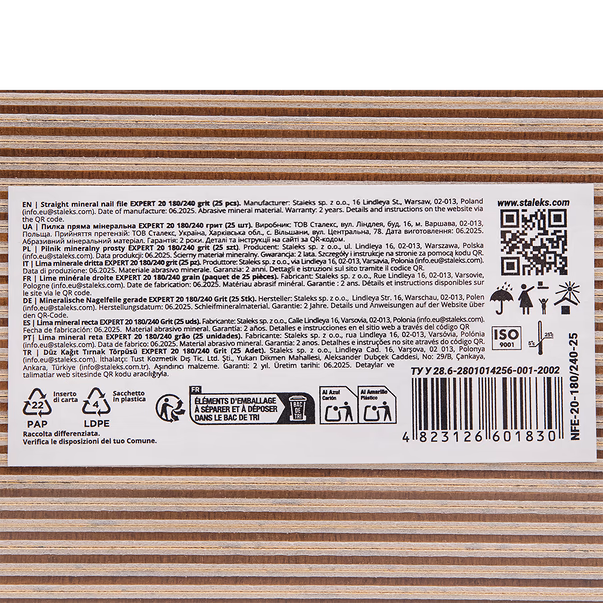 Специальное минеральное покрытие пилки Сталекс Про одноразовой прямой EXPERT 20 180/240 грит предохраняет абразив от засорения, а тонкий пенный слой снижает давление на ноготь, обеспечивая бережную обработку без микротрещин и расслаивания. Гибкая пластиковая основа в сочетании с высококачественным абразивом Expert White гарантируют долговечность и удобство при работе. Набор из 25 пилок особенно практичен для профессиональных мастеров маникюра.Staleks PRO пилка минеральная EXPERT 20 прямая NFE-20-180/240-25: особенностидве рабочие поверхности: 180 грит — для обработки натуральных и искусственных ногтей, 240 грит — для полировки и опиливания натуральных и искусственных пластин, их подготовки к нанесению покрытия;минеральное покрытие пилочки защищает абразив от засорения;тонкий пенный слой снижает давление на ногтевую пластину и предотвращает повреждения;эффект «запаивания» края препятствует расслаиванию пластины;гибкая пластиковая основа обеспечивает точность и удобство в работе;высококачественный абразив Expert White сохраняет свои характеристики на протяжении длительного времени;прямая форма удобна для точного формирования свободного края;подходит для маникюра и педикюра.Сталекс Про пилки одноразовые EXPERT 20 180/240 грит прямые: применениеПрименяйте сторону 240 грит для полировки и опиливания натуральных и искусственных ногтей, а также для подготовки к нанесению покрытия.Применяйте сторону 180 грит для коррекции формы натуральных ногтей, лёгкой полировки и подготовки к покрытию.Для точного формирования свободного края выполняйте прямые движения вдоль него.Используйте минеральную пилку NFE-20-180/240-25 для удаления огрубевшей кожи с околоногтевых валиков, при необходимости меняя направление движений.Завершайте обработку лёгкими движениями, «запаивая» край пластины, чтобы предотвратить расслаивание.После использования счищайте пыль с пилочки мягкой щёткой для сохранения свойств абразива.