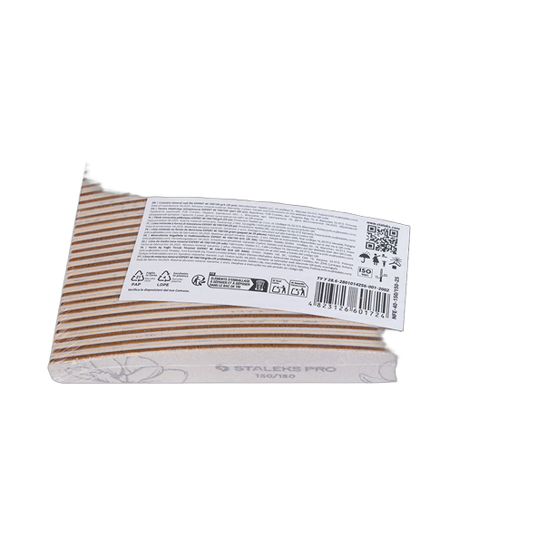 STALEKS PRO EXPERT 40 kertakäyttöiset kynsiviilat 150/150 karkeudella ja puolikuuprofiili on suunniteltu erityisesti kiinteiden luonnollisten ja tekokynsien muotoiluun. Keskikarkea työpinta hioa kynnen ääriviivaa hellävaraisesti aiheuttamatta mikrohalkeamia tai vaurioita levyyn. Erottuva puolikuun muoto parantaa pääsyä ahtaisiin alueisiin ja parantaa arkistointitarkkuutta.