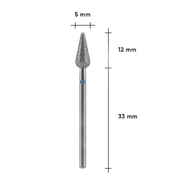 Staleks Pro EXPERT teemantfrees pirnjas terav kujuga ja sinise (keskmise) abrasiiviga on loodud naha delikaatseks töötlemiseks aparaatse maniküüri ja pediküüri käigus. Tööosa läbimõõt on 5 mm ning tööala pikkus 12 mm. Terav pirnjas kuju ühendab endas kuuli ja terava leegi funktsioonid, võimaldades tööd raskesti ligipääsetavates kohtades ning naha välispindade viimistlemist.
