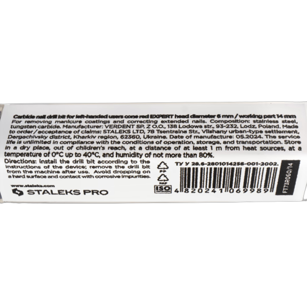 Staleks Pro EXPERT kõvasulamfrees koonuse kujuga ja punase (peene) abrasiiviga on loodud vasakukäelistele meistritele aparaatse maniküüri ja pediküüri protseduurideks. Tööosa läbimõõt on 6 mm, pikkus 14 mm. Täismetallist instrument peene ristsuunalise soonega tagab pehme ja delikaatse töö.