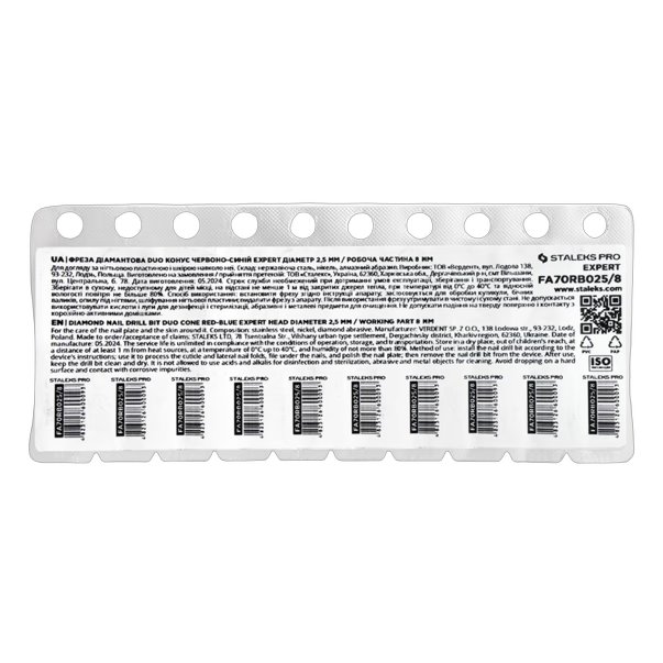 Staleks Pro EXPERT teemantfrees DUO kärbitud koonuse kujuga ja punase-sinise (pehme-keskmise) abrasiiviga on topeltteemantkattega instrument aparaatse maniküüri ja pediküüri jaoks. Tööosa läbimõõt on 2,5 mm, pikkus 8 mm. Kärbitud koonus võimaldab tööd nii looduslike kui ka kunstküüntega, küüneplaadi vormi kujundamist ja pinna lihvimist.