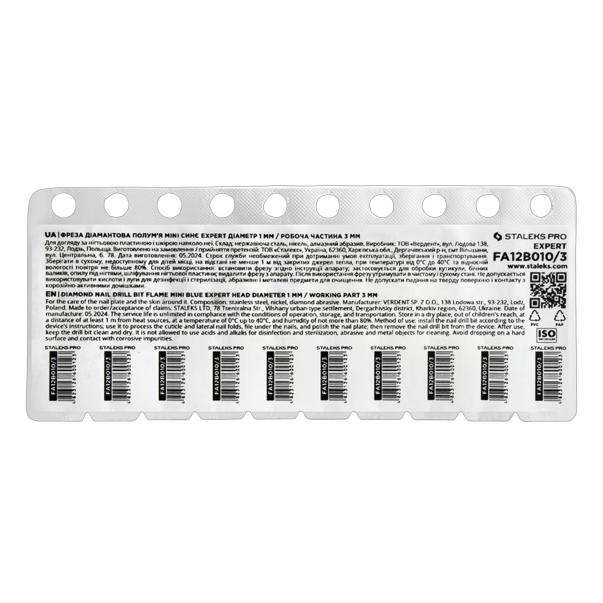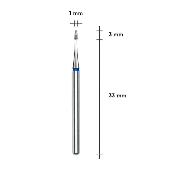 Staleks Pro EXPERT teemantfrees leegi kujuga ja sinise (keskmise) abrasiiviga on miniatuurne instrument delikaatseks nahatöötluseks aparaatse maniküüri ja pediküüri käigus. Tööosa läbimõõt on vaid 1 mm, pikkus 3 mm. Minifrees leegi kujus töötleb kutiikulit ja küüneplaate ohutult, ilma vigastusriskita.