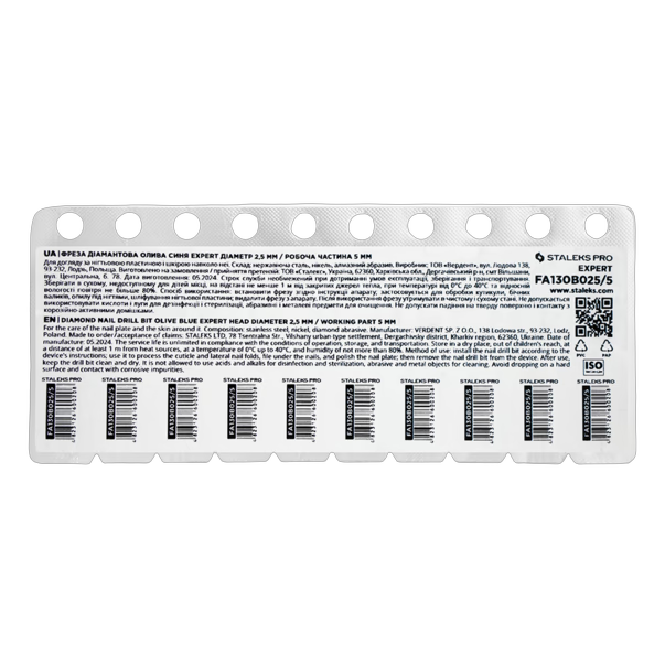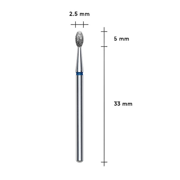 Staleks Pro EXPERT teemantfrees oliivi kujuga ja sinise (keskmise) abrasiiviga on mitmekülgne instrument naha delikaatseks töötlemiseks aparaatse maniküüri ja pediküüri käigus. Tööosa läbimõõt on 2,5 mm, pikkus 5 mm. Oliivi kuju töötleb kutiikulit, külgvalle ja kalluseid ohutult, ilma nahakahjustuse riskita.