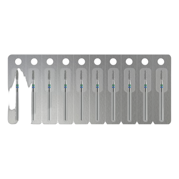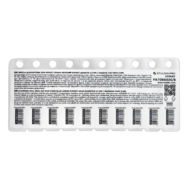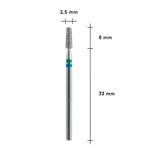 Staleks Pro EXPERT teemantfrees DUO kärbitud koonuse kujuga ja sinise-rohelise (keskmise-jämeda) abrasiiviga on topeltteemantkattega professionaalne instrument aparaatse maniküüri ja pediküüri jaoks. Tööosa läbimõõt on 2,5 mm, pikkus 8 mm. Keskmise-jämeda jäikusega kärbitud koonus sobib kunstkatetel töötamiseks, vormi kujundamiseks ning lõhede lihvimiseks pediküüris.