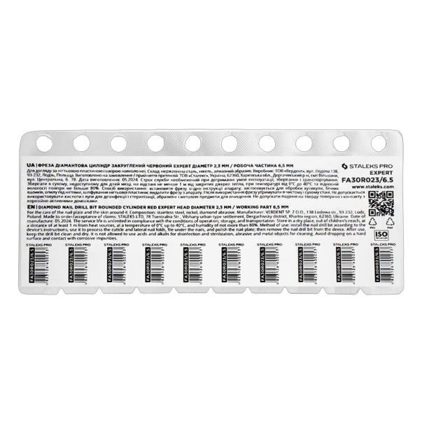 STALEKS PRO EXPERT teemantfrees ümarotsalise silindri kujuga ja punase (peene) abrasiiviga on õrn ja ohutu instrument aparaatse maniküüri ja pediküüri jaoks. Tööosa läbimõõt on 2,3 mm, pikkus 6,5 mm. Peene abrasiiviga ümarotsaline silindri kuju sobib külgvallide, kalluste ja lõhede töötlemiseks, geeli ja akrüüli ülevoolu eemaldamiseks ning küüneplaatide lihvimiseks enne kunstmaterjali kandmist.