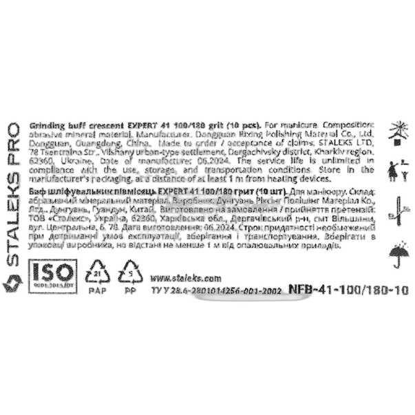 Staleks Pro EXPERT 41 ühekordsed poolkuu kujulised maniküüripuhvrid abrasiiviga 100/180 grit on mitmekülgsed tööriistad küüneplaadi tasandamiseks, kunstkatte kandmise ettevalmistamiseks ning looduslikele küüntele soovitud kuju andmiseks. Poolkuu kuju koos ümarate ja täiendavalt töödeldud otstega tagab ohutu töö, välistades kliendi vigastamise, ning võimaldab mugavat töötamist kutiikulite ja siinuste piirkonnas.