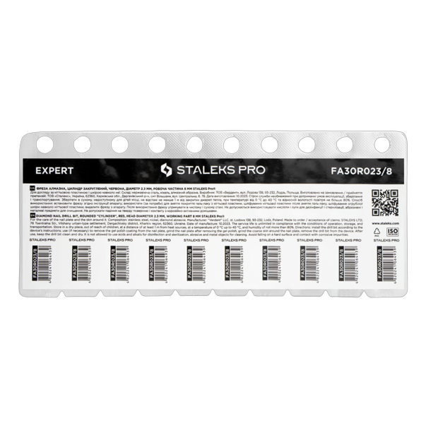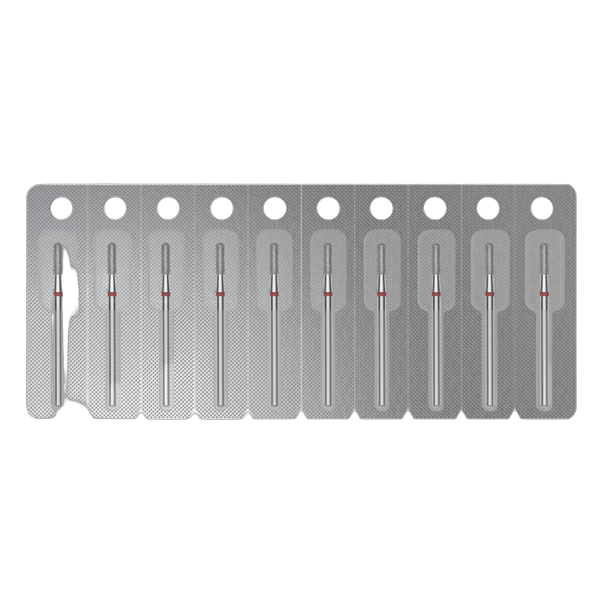 STALEKS PRO EXPERT peene abrasiivsusetasemega teemantfrees ümardatud silindri kujuga on ideaalne valik delikaatseks küünelplaadi töötlemiseks. Punane märgistus tähistab peent abrasiivsustaset, mis võimaldab õrna ja täpse viimistluse nii maniküüri kui pediküüri tegemisel.