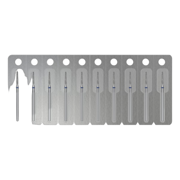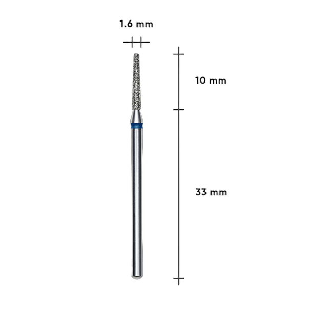 Kärbitud koonuse kuju on saadaval kahes abrasiivsusetasemes: peen (punane) ja keskmine (sinine), läbimõõduga 1,6 mm ja tööosa pikkusega 10 mm. Sinine märgistus tähistab keskmist abrasiivsustaset, mis sobib igapäevaseks põhitöötluseks. Maksimaalne pöörlemiskiirus kuni 30 000 p/min.