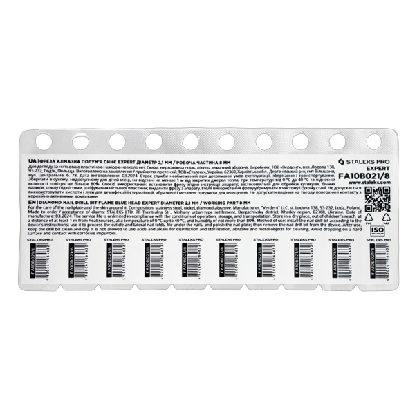 Leegikujuline frees on saadaval peene (punane) ja keskmise (sinine) abrasiivsusetasemega. Sinine tähis viitab keskmisele teritusele, mis pakub head tasakaalu tõhusa materjali eemaldamise ja turvalise töö vahel. Tööosa pikkus 8 mm, maksimaalne pöörlemiskiirus kuni 30 000 p/min. Suurem 2,1 mm läbimõõt sobib eriti hästi kunstkatte eemaldamiseks ja laiema küüneümbruse ala töötlemiseks.