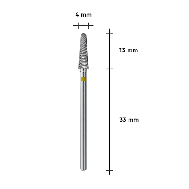 Kärbitud koonuse kuju on universaalne — frees näitab suurepärast tulemust nii maniküüris kui ka pediküüris. Ülipehme kollane teritus, kuumenemis- ja vibratsioonikindlus, kõrge vastupidavus ning pikaajaline teravus on selle otsiku peamised eelised.