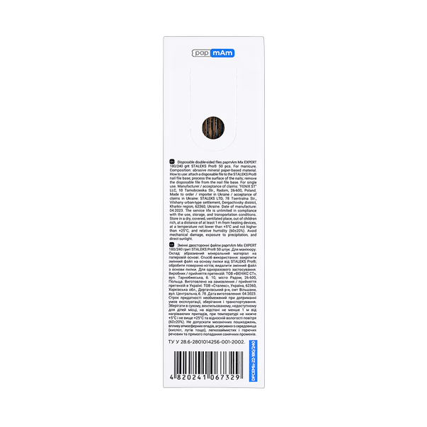 STALEKS PRO papmAm Mix 22 kahepoolsete vahetusviilidete komplekt sisaldab 50 viili ja on mõeldud ühekordseks kasutamiseks maniküürisalongides, kus järgitakse kõrgeid hügieeninõudeid. See innovaatiline komplekt on suurepärane alternatiiv liimipõhistele ühekordsetele viilidele. Kaitsekest katab täielikult viilialuse otsad ning vahetusviil libiseb kergelt ja tihedalt peale, välistades libisemise ja nihkumise.\n\npapmAm Mix disain sisaldab kahepoolset viili musta ja valge kattega. Must abrasiiv on mõeldud põhitöötluseks ja valge viimistluseks. See täiustatud kombinatsioon lihtsustab ja kiirendab viilimisprotsessi, tagades samal ajal kliendi jaoks turvalise protseduuri. Vahetusviil eemaldub viilialuselt kergelt ilma kleepjälgi jätmata. Tänu aluse täielikule katmisele on naha vigastamise risk välistatud.\n\nKomplekti omadused: liimivaba kinnitus, valmistatud keskkonnasõbralikust käsitööpaberist, kerge paigaldamine ja eemaldamine, kindel fikseerimine tööajal, kõrgekvaliteediline abrasiiv. Abrasiivus 180/240 gritti, mõõt 140 x 20 mm. Sobib ideaalselt sirgetele alustele WBE-20, SPBE-20 ja MBE-20.