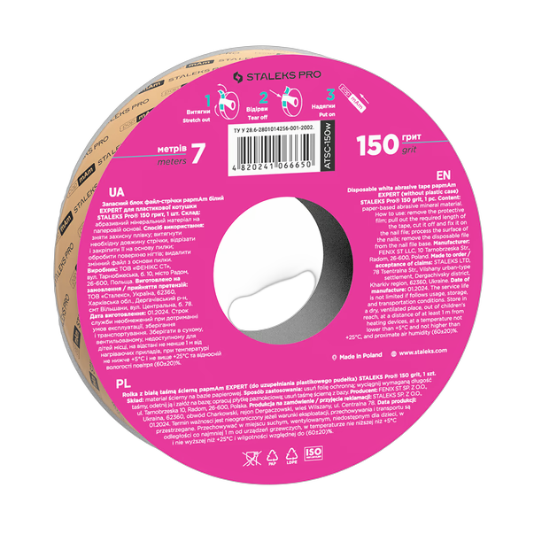 STALEKS PRO EXPERT vahetuslint papmAm 150 gritti on moeldud originaalse "soorikukujulise" plastikrulli taeitmiseks. Lindi vahetamine on kiire ja mugav — avage plastikuest ja asetage uus lint.