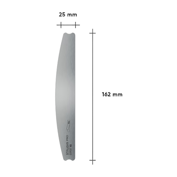 STALEKS PRO EXPERT 40 metallalusviil poolkuu kujuga on professionaalne maniküüri- ja pediküüriinstrument, mis on loodud meistritele, kes hindavad kvaliteeti, hügieeni ja mugavust. Ergonoomilise kujuga — keskel lai ja otstest kitsam — on see mugav täpse töö tegemiseks. Valmistatud kõrgekvaliteedilisest roostevabast terasest korrosioonikindluse, vastupidavuse ja intensiivse kasutustaluvusega.