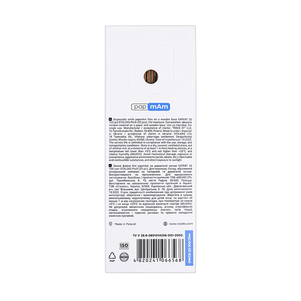 papmAm STALEKS PRO EXPERT 22 valged vahetusfailid 100 griti karedusega on 25 ühekordset viilimislehte sirgel puidust alusel, mis on loodud professionaalseks salongikasutamiseks. Abrasiiv ökoloogilisel kraft-paberil tagab kvaliteetse töötulemuse.