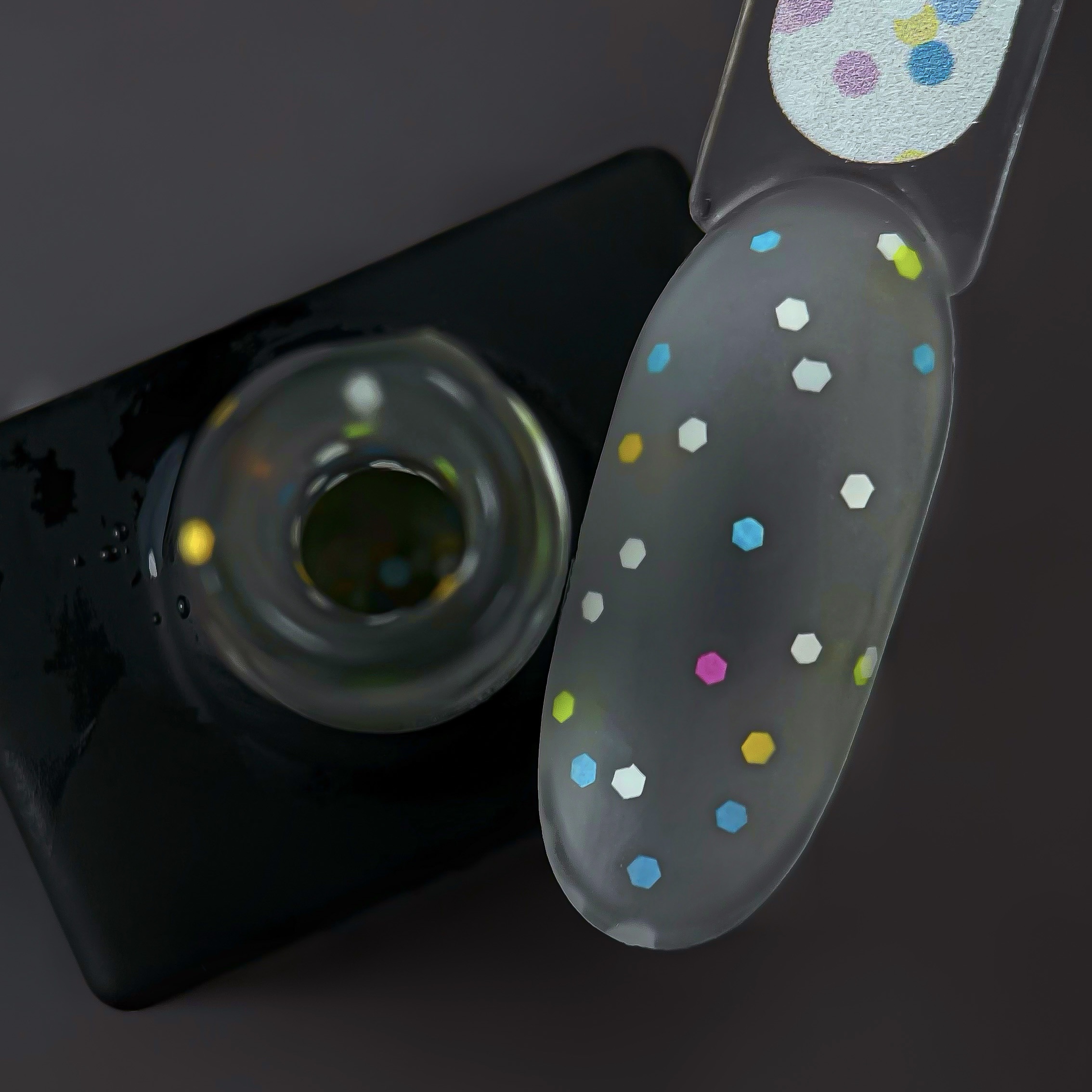 NAILSOFTHEDAY Party top matte on erineva suurusega neoonkuusnurki sisaldav dekoratiivne pealislakk, kvaliteetne, mittekleepuv ja UV-filtrivaba. Tänu kaasaegsele valemile joondab ja katab küüneplaadi suurepäraselt: - takistab lõhenemist, ei hõõru maha; – neoonkuusnurgad; - keskmine konsistents; - ei oma kleepuvat kihti; - ei anna kollasust.
