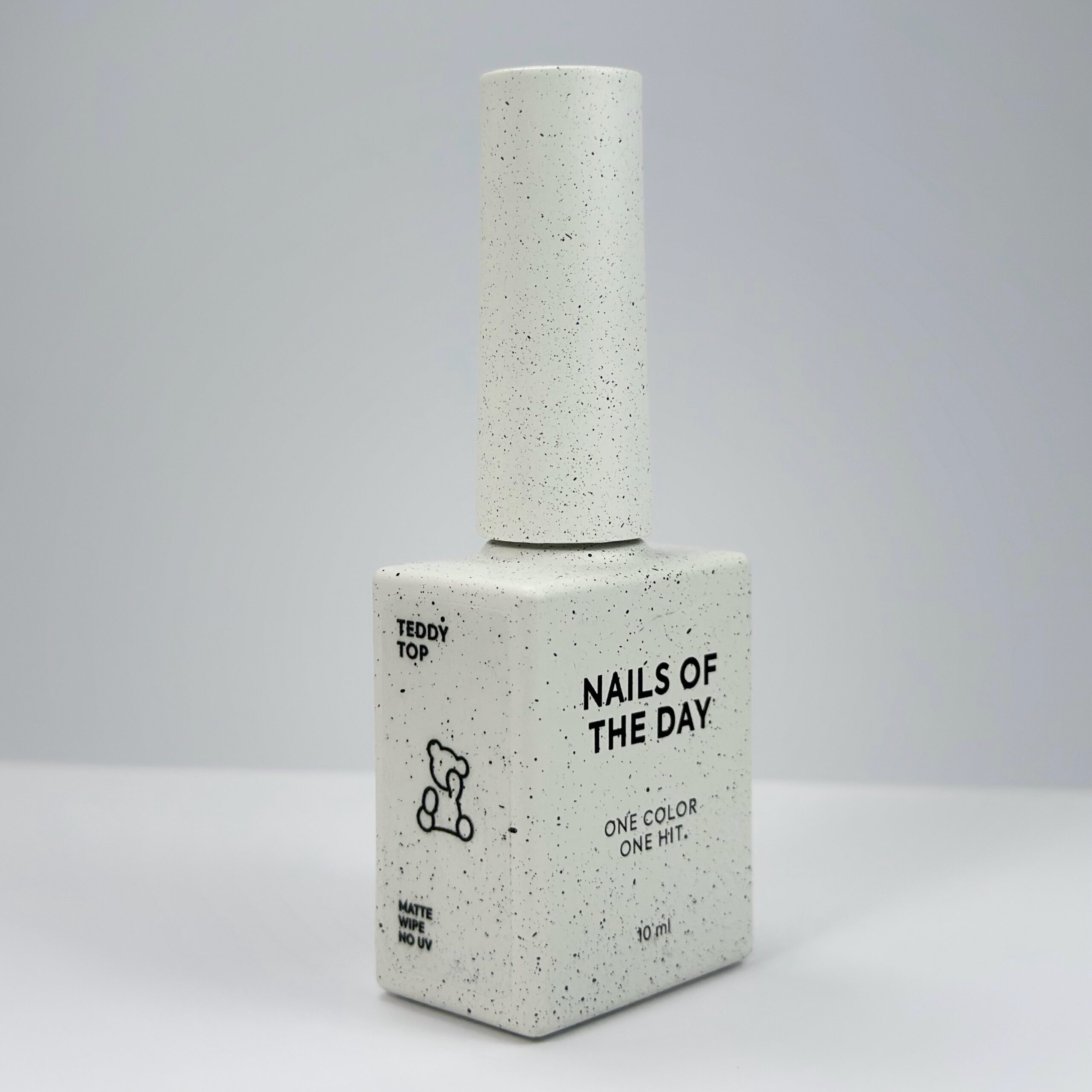 Nailsoftheday TEDDY TOP on kleepuva kihiga, uue koostisega matt plüüstop. Säilitab plush villi kvaliteedi kogu maniküüri kestuse jooksul. Ei muutu kollaseks. Sametine matt viimistlus, mis muudab iga maniküüri esteetilise naudingu teoseks. Tänu pehmele visuaalsele efektile rõhutab see küünte kuju ja on suurepäraselt ühendatud kunstikujundusega. Eriti soovitatav pigmentide, akvarellide ja õhukeste dekoratiivkihtide jaoks. Kui Teddy pealislapiga ei kasutata pikka aega, soovitame anuma sisu enne küüntele kandmist põhjalikult läbi segada, et vältida katte ebatasasusi. MATTE / WIPE / NO UV, vedel konsistents TEDDY TOPi eelised: – mõjub sametiselt nagu kaisukarul; – on dispersioonikihiga; - pärast polümerisatsiooni on vaja tagada pinna piisav jahutamine, et plüüsiefekt tekiks umbes 20-30 sekundit, alles pärast seda eemaldame kleepuva kihi. – elastne ja keskmise konsistentsiga, mis tagab täiusliku vastupidavuse 4 nädalaks; – ei hõõru maha, ei määrdu, mustus pühib kergesti maha; - vastupidav kemikaalidele; - ei ole ultraviolettkiirgust, ei kollasta heledaid toone, ei heledamaks tumedaid toone; – ideaalne tembeldamiseks, akvarellikujunduseks ja liuguriteks; – kaitseb katet pragunemise, mehaaniliste vigastuste ja põlemise eest; - ei hõõru maha; - on kleepuva kihiga.