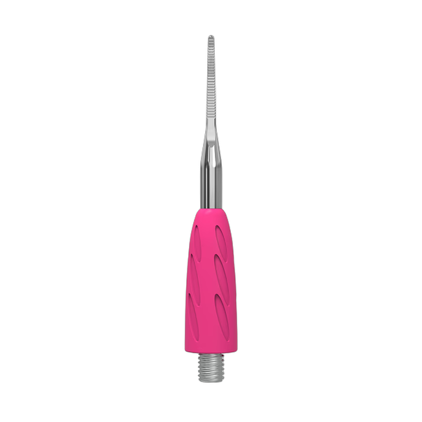 Manufactured from high-alloy medical-grade steel with a refined satin finish, the rasp delivers exceptional durability and wear resistance. The pointed tip ensures fast, precise results during every session. On the reverse side, a threaded mechanism provides a secure, stable connection to the handle. Bright-pink hypoallergenic silicone covers the non-working section, providing a comfortable, non-slip surface that reduces hand tension and fatigue. Both the steel and silicone components are fully compatible with autoclave and dry-heat sterilization, as well as chemical disinfection using aluminum-compatible solutions.