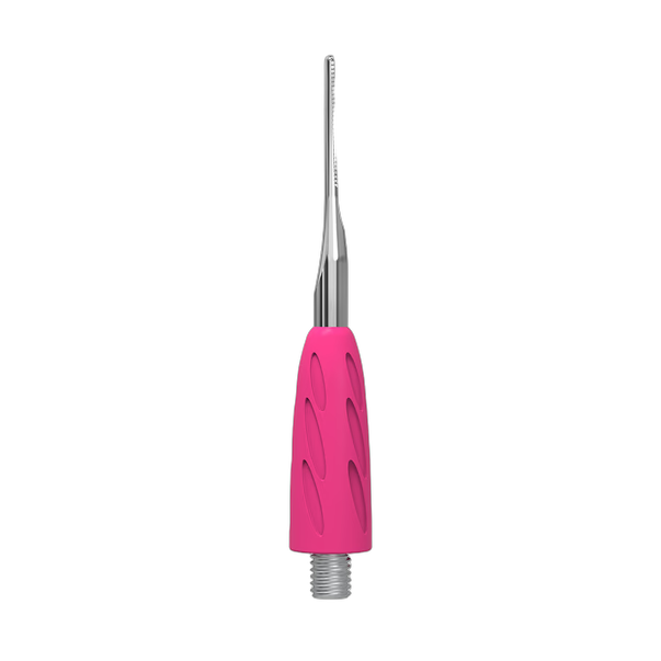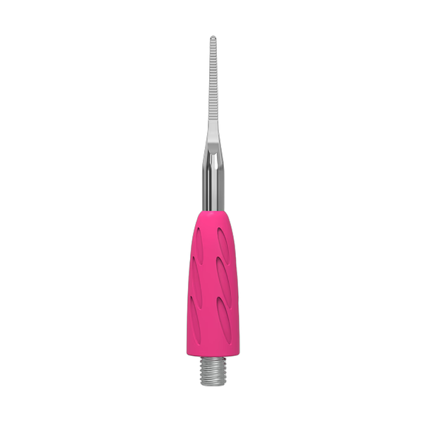 Crafted from premium stainless steel with a silicone accent, the UNIQ 36 module features a threaded connector on the reverse for a solid bond with the handle. The pointed tip enables pinpoint accuracy and swift procedural execution. A bright pink hypoallergenic silicone coating is soft to the touch and provides reliable anti-slip performance, keeping the tool secure in your grip while reducing hand strain during extended sessions. Made from high-alloy medical steel known for superior durability and wear resistance, the tool showcases a pleasant satin finish. The UNIQ series polish protects against corrosion through disinfection and sterilization, and the silicone sleeve cleans and sanitizes effortlessly.