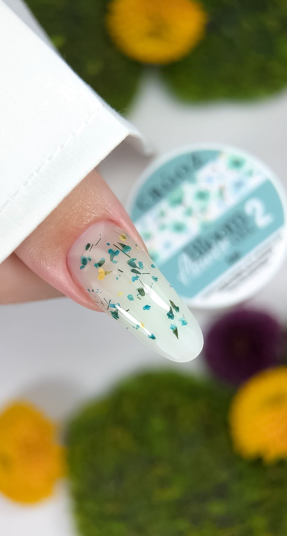 Bloom Flower Gel №02 – гель с сухоцветами küünedisainiks (голубовато-мятные и жёлтые лепестки)
