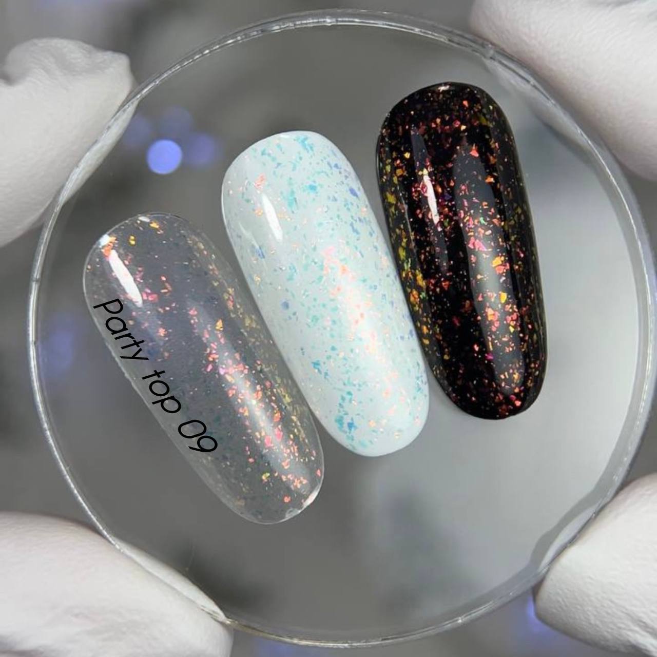 NAILSOFTHEDAY Party top 09 on ilma kleepuva kihita läikiv, holograafilise vilgukiviga topp. Vilgukivi ei muutu heledatel toonidel kollaseks ja topi põhi ei lisa tumedatele värvidele sinakust. — sobib igat tüüpi katmiseks;