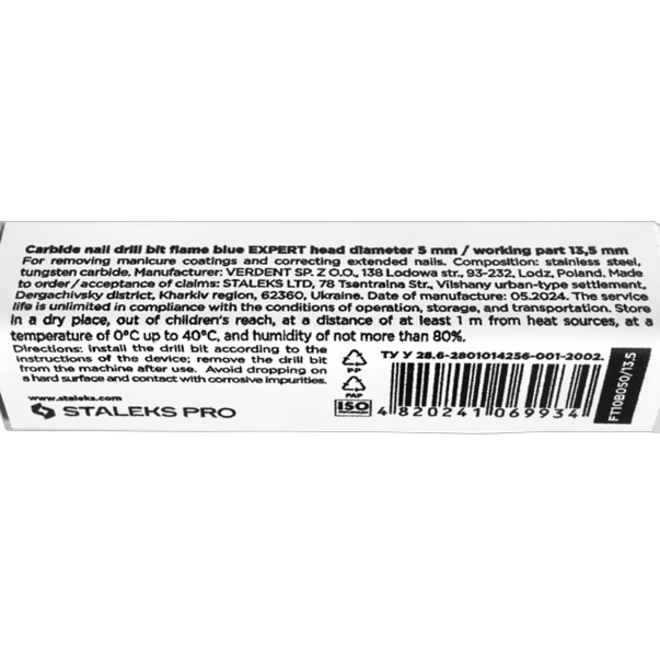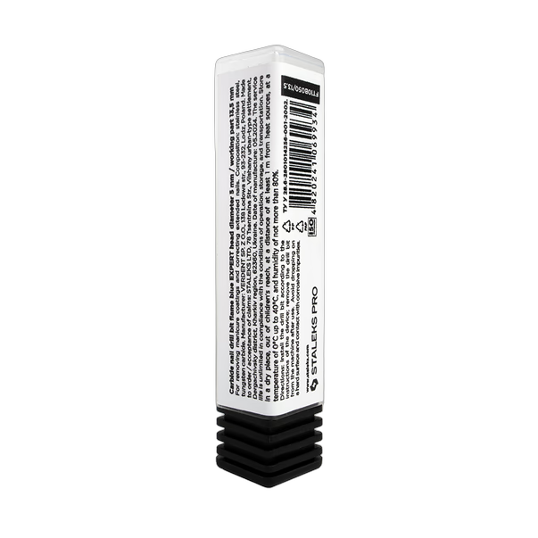 Staleks PRO EXPERT sinine kõvasulamfrees leegi kujuga (5 x 13,5 mm) on tervisikust metallist instrument keskmise abrasiivsuuse ja jäikusega. Tööosa keskmise risti- ja põikilõikega eristub kõvasulamfreesidele omaselt sellega, et lõikab materjali, tekitades laaste, mitte tolmu.